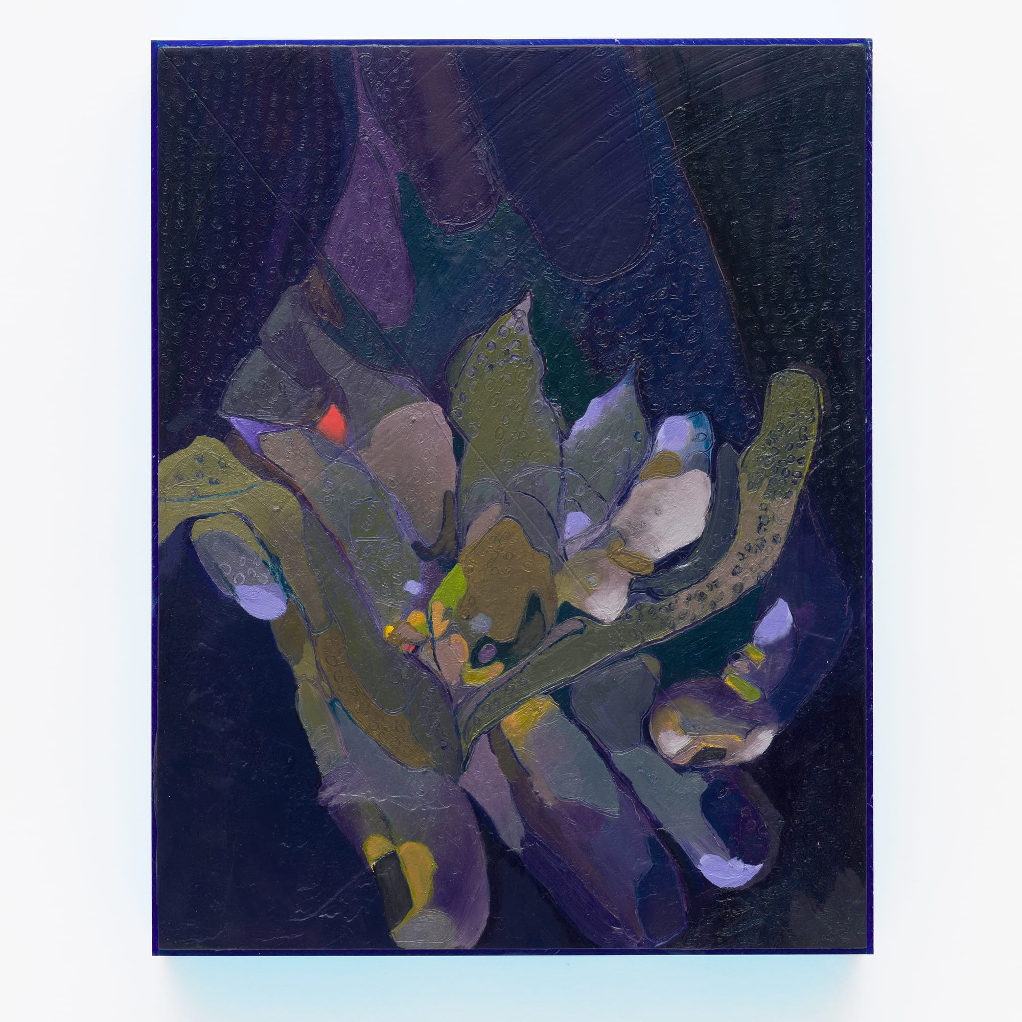 Baseera Khan shows a 2025 painting titled Holding, Blue Histories, made on a wooden panel and presented in a clear Lucite frame. The surface is dominated by layered blue tones, with variations in density and brushwork. The paint builds up through repeated layers, forming an image that suggests a hand emerging from overlapping blue and violet tones.
