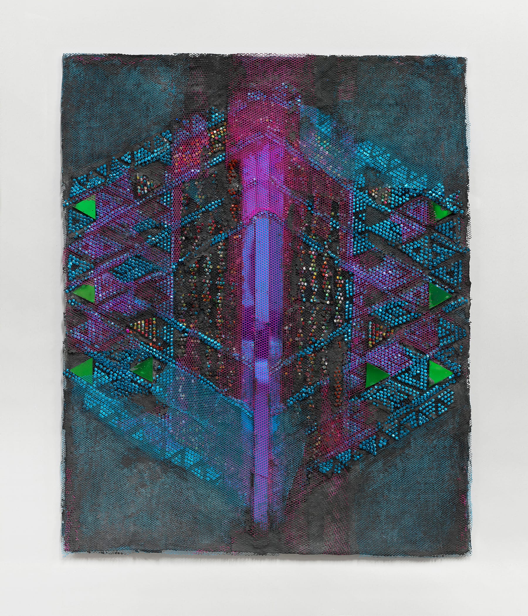 Armita Raafat’s 2024 work is a small mixed-media piece made from handmade paper and fabric. The paper has an uneven texture and is stitched together in several places, with embroidered textile elements attached. Fine mesh is layered into the composition, and small mirrors are embedded throughout.
