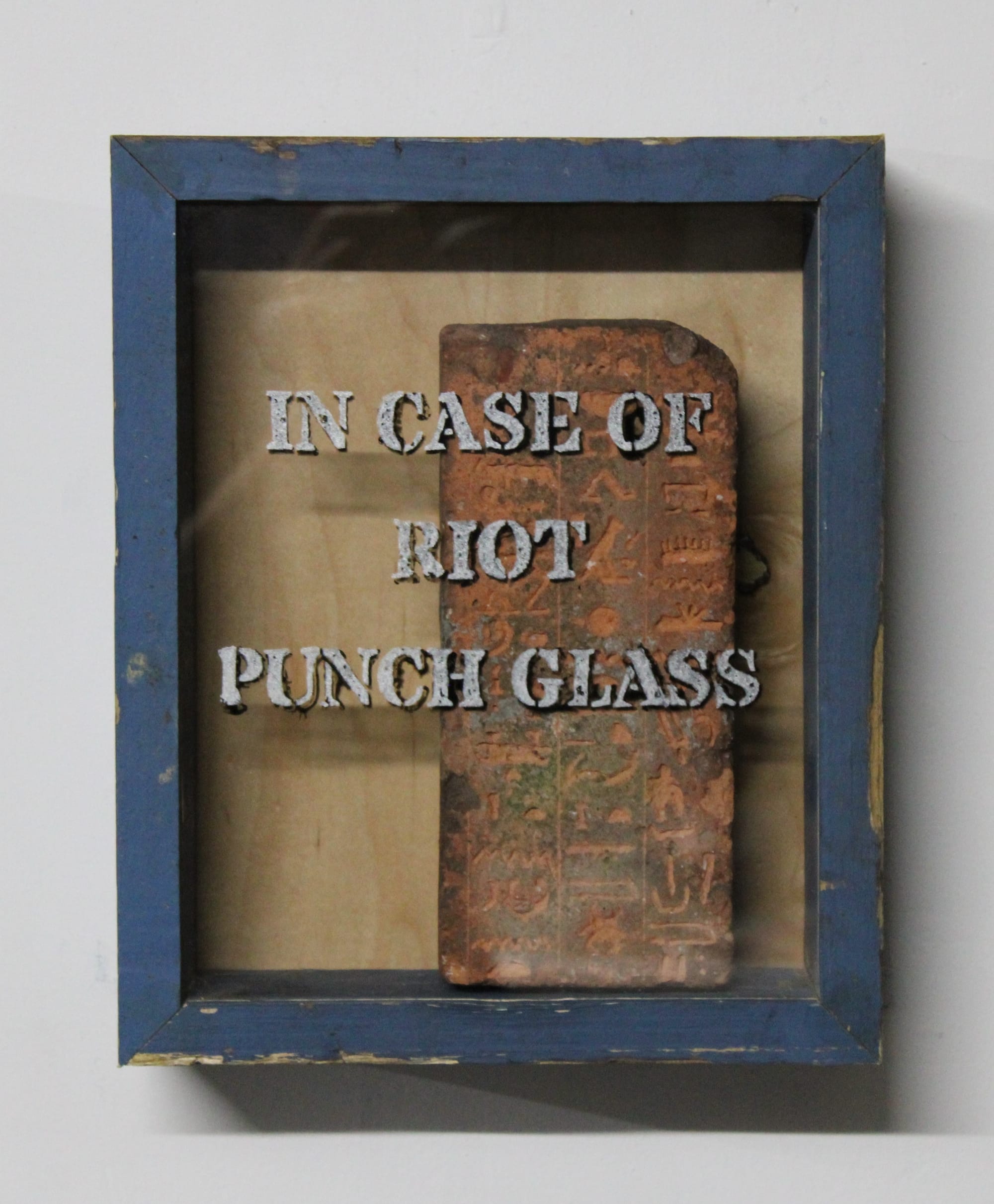 Justin Sterling’s 2025 work Riot Box (Brick) is a wooden display box mounted on the wall with a glass front. Inside, there is a single weathered brick with visible marks and wear. The glass reads “IN CASE OF RIOT / PUNCH GLASS,” echoing the language of emergency cabinets.