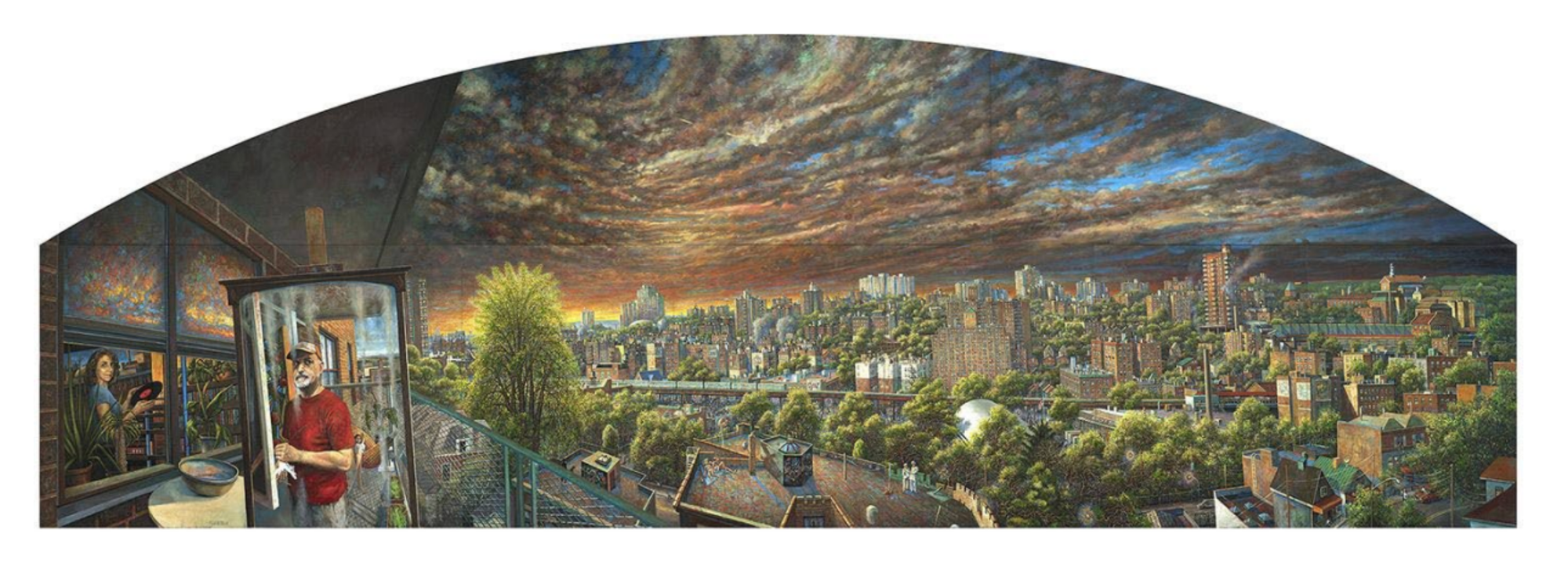 Hauben said the painting attempts to capture the city's scale and density, including the number of buildings and windows visible from the terrace and the sense of activity within them. He described the difficulty of making ordinary structures visually engaging while remaining specific to the location.