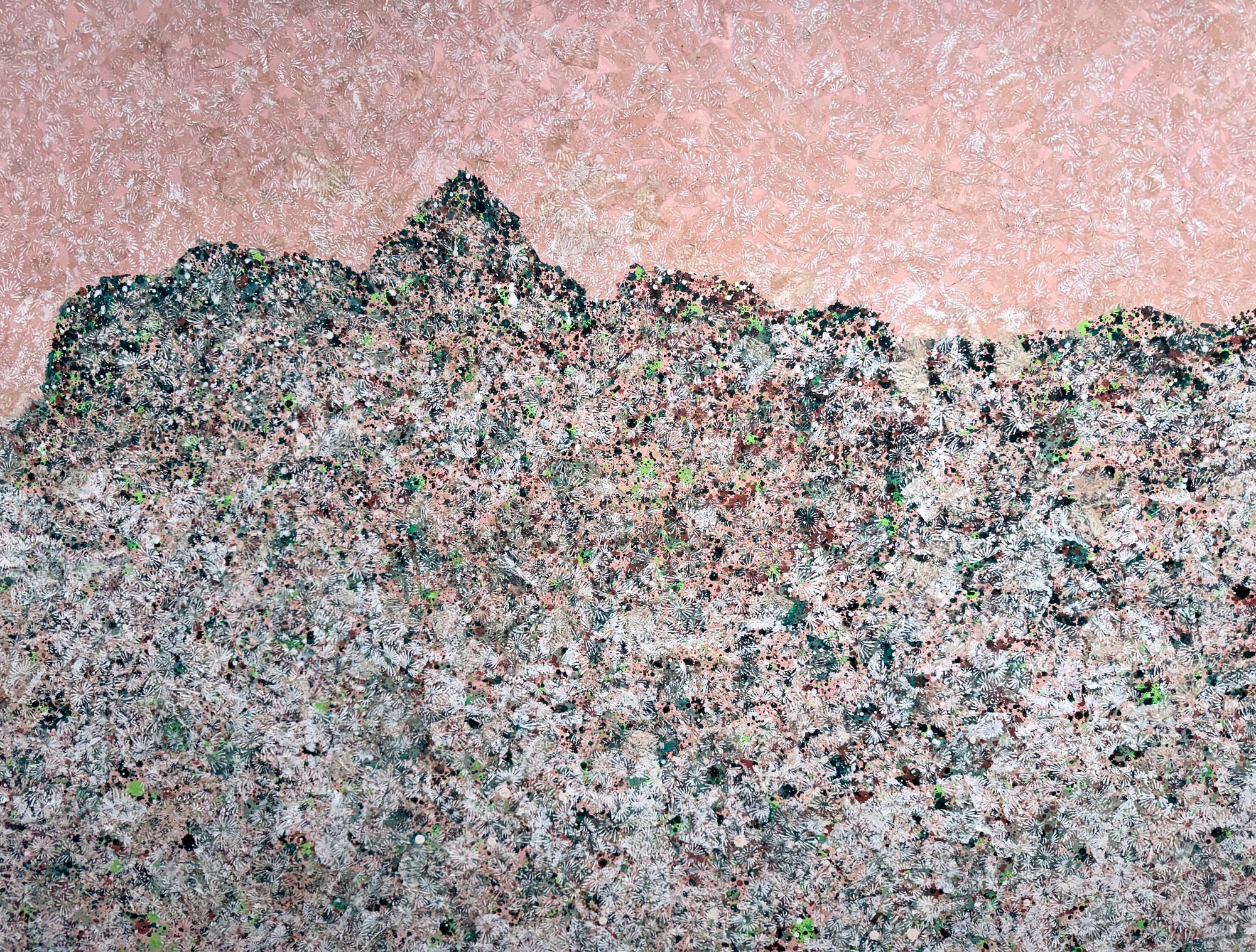 "My favorite flower is the cherry blossom. Its hakanasa-fragility and fleeting beauty-comes from its thin, delicate petals and short blooming period,” Chizuco wrote in her wall text. “In Blooming, I express the blossoms' brief life-often lasting only about one week-through luminous, radiant color.”