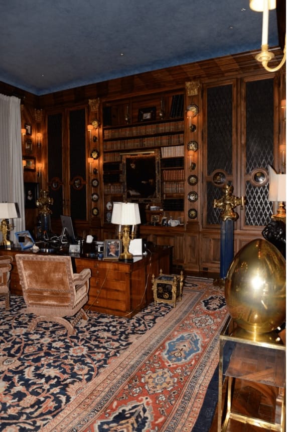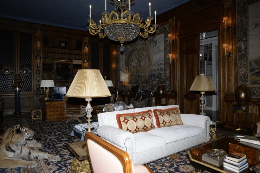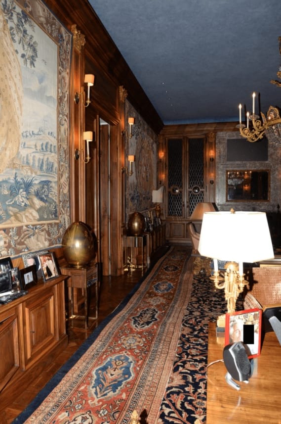 As related images were grouped, a more complete picture emerged of how art and décor functioned within the home. One cluster shows what might be described as a “tiger room,” anchored by a taxidermied tiger amid medievalizing décor that evokes a stripped-down, almost theme-park version of a museum gallery. It is closer to a cheap imitation of the Met Cloisters than a private collection.