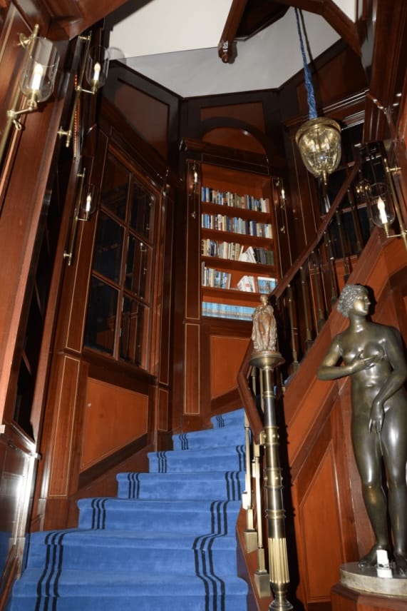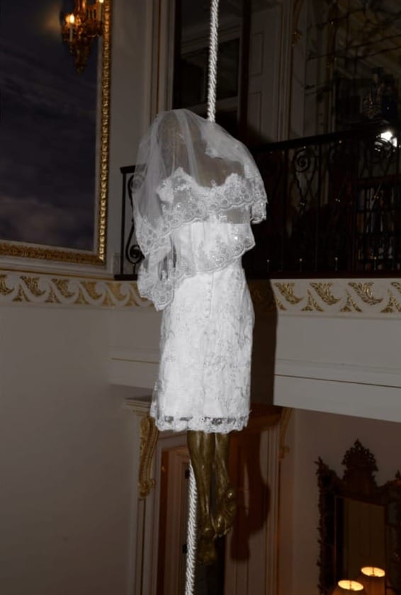 Among the most revealing moments of Epstein’s curation comes from a Justice Department photograph of a sculpture of a nude woman, shown hanging from a rope over the home’s main stairway. In the photos, the figure is shown wearing a bridal veil, a costume that changes the sculpture from a neutral figure into a staged scene. The bridal veil does not appear to be a part of the original artwork.