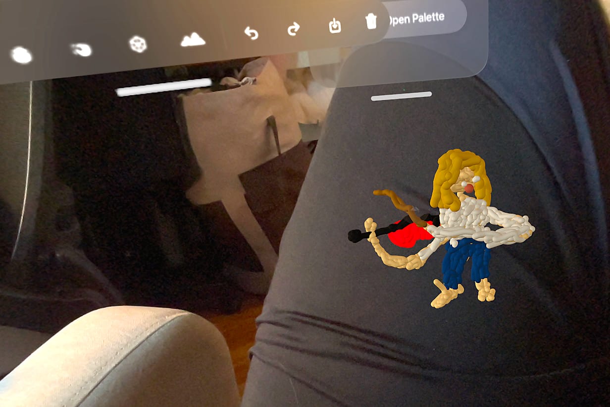 What still sets Crayon apart from AirDraw, however, is its imagination. The app includes SharePlay collaboration features and a palette system that lets users dip their fingers into colors. It can also import USDZ files and allows users to add texture maps to shapes using images from their library, though this currently works only on predefined shapes rather than the surface of hand-drawn elements.