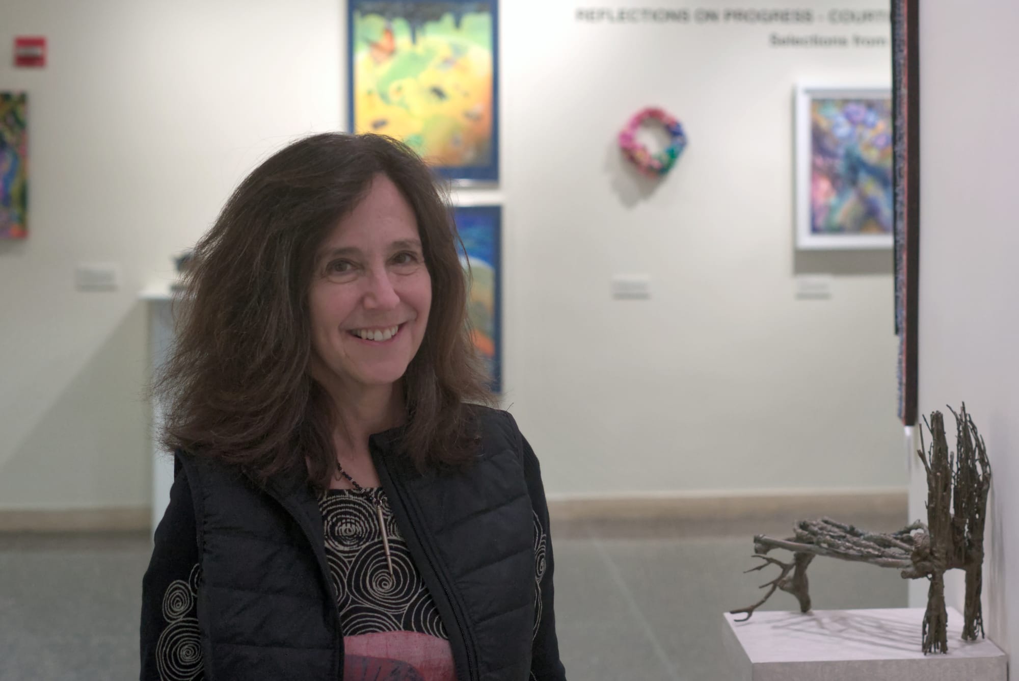 She noted that no works were excluded for safety reasons, crediting the organization's planning. One artist, Pam J. Brown, typically creates sharp objects. For this exhibit, Brown included a sculpture of a tree stump and saw made from polymer clay, which is the only piece displayed under glass.